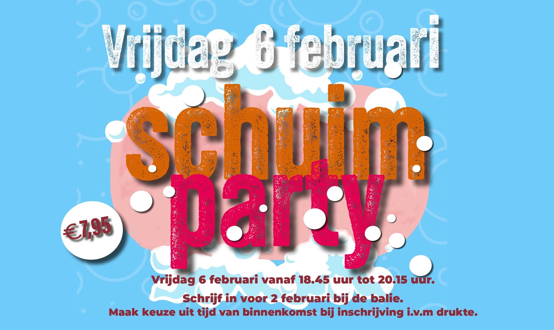 Op vrijdag 6 februari van 18.45-20.15 uur hebben we in ons zwembad een schuimparty. Kom je ook? Geef je snel op bij de balie.